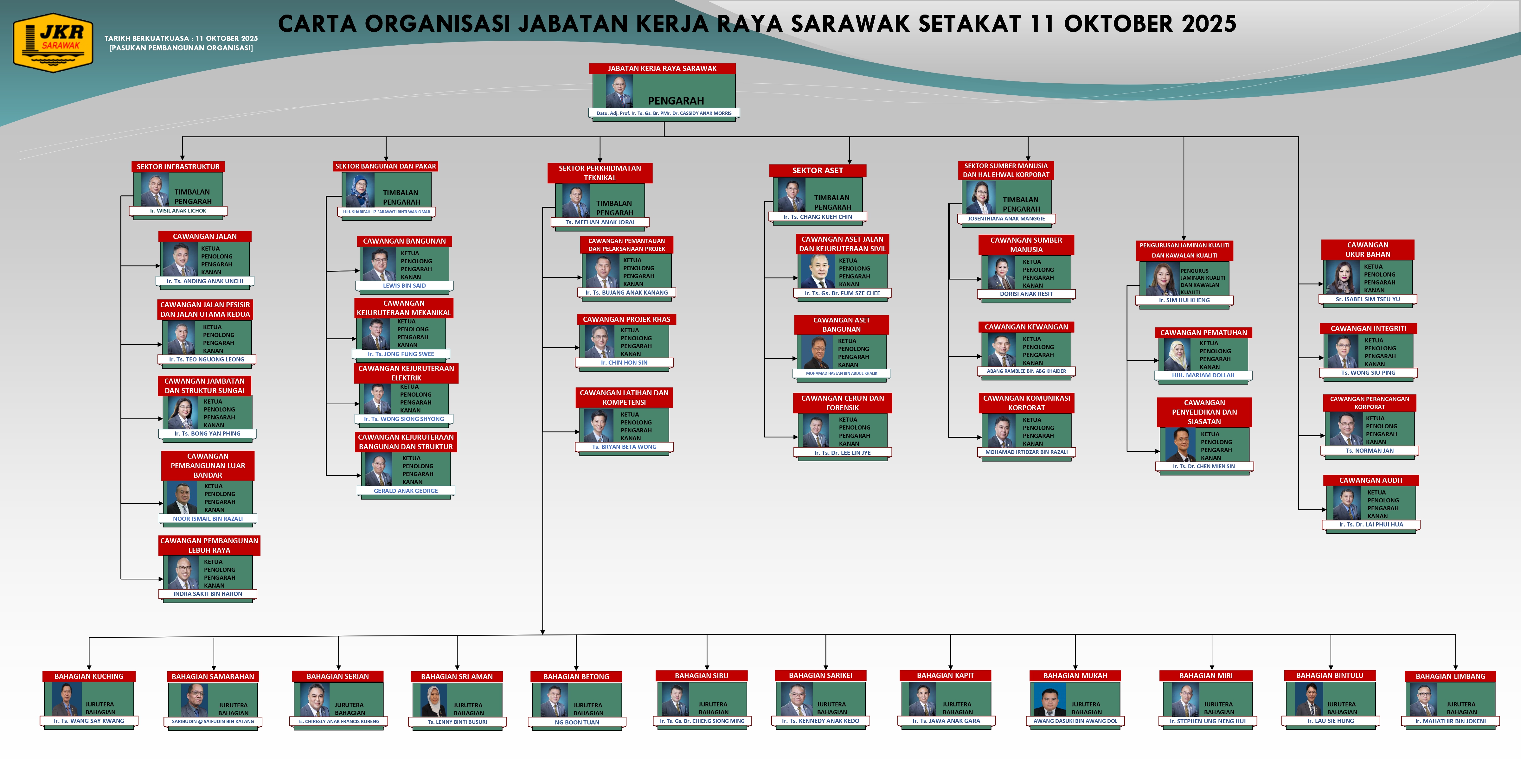 The current JKR Sarawak organization is structured based on the conventional lines with a Headquarters setup divided into specialist technical and non-technical branches, and twelve (12) Divisional Offices.